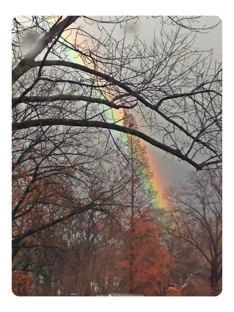 For some reason I was prompted to get up and go to the window with my camera (phone). I wasn’t looking for a rainbow, but there it was!! It wasn’t even raining where I was.