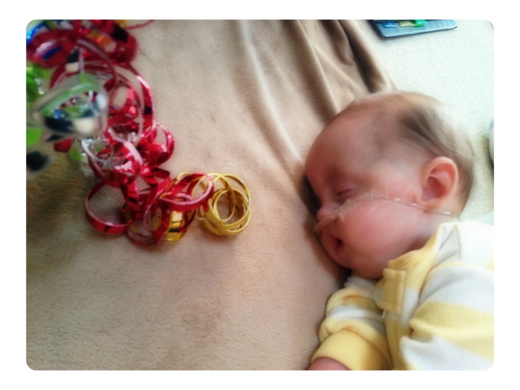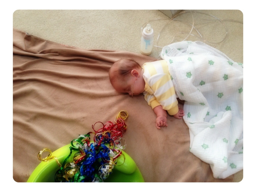 Nora fell asleep toward the end of her physical therapy session!! It’s exhausting trying to grab at mylar streamers!!
