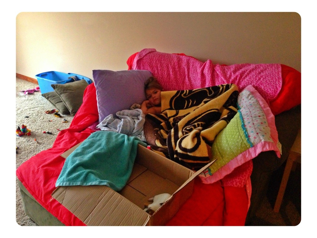Daddy set up a cozy little nest for her in the basement in front of the TV. Even Piggy came down to spend some time with her. It’s been very hard keeping her away from Nora and very hard to distribute my time evenly between the kids. We gave Greta the option of staying downstairs or going up to her room last night, and she did want to sleep upstairs. She has had some trouble getting used to sleeping in her loft bed so we put another bed underneath and she opted to sleep there.