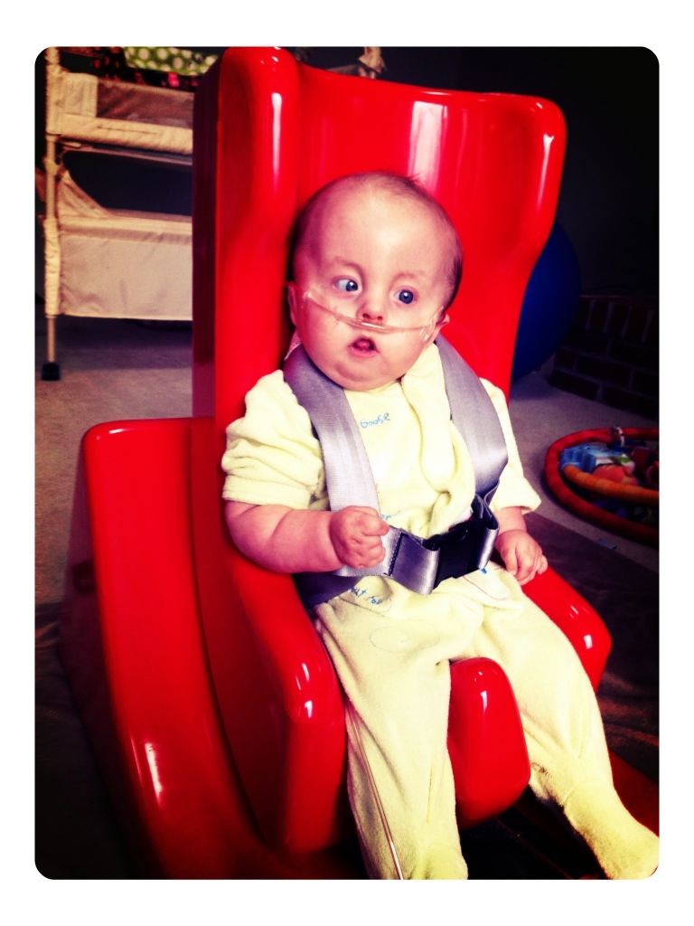 Here is a big, big girl doing physical therapy this morning in her red Tumbleform chair. She really knows how to hold her sweet fuzzy head up! Gavin thinks she looks like she’s about to ride on Firehawk (roller coaster).