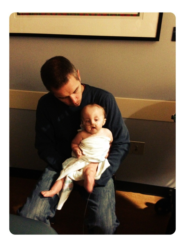 Here is our stinky little Cupid waiting patiently for the doctor with Daddy.