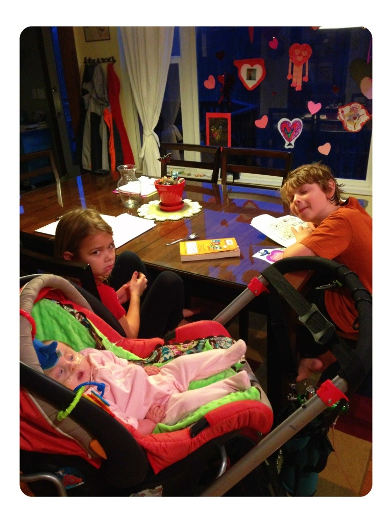 Nora is usually asleep while the big kids are getting ready for school, but was wide awake this morning. She just wants to be close to everyone!