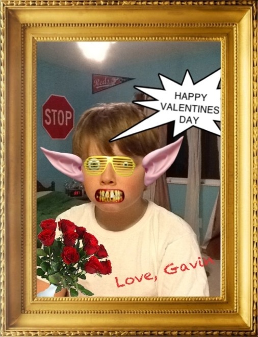 There certainly is an app for everything. This is the design that Gavin, my FUNNY Valentine came up with. We were laughing so hard together as we created this. I printed them out for him to pass out to his classmates as I also did for Greta’s. If this doesn’t confirm that we’re a little strange over here, I’m not sure what will. I keep laughing every time I look at this imagining the parents of a classmate innocently perusing through their child’s Valentines only to be confronted with this darling aberration! “(Gasp!) WHO IS GAVIN??!!” Happy Valentine’s Day from Gavin!