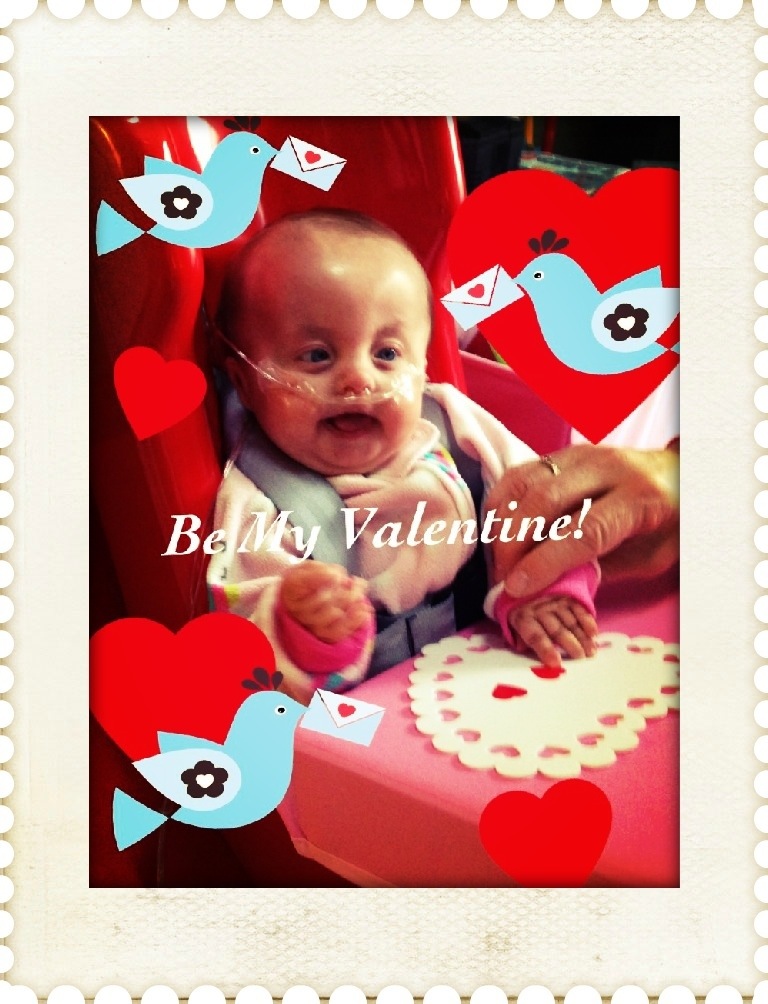 Nora made a beautiful Valentine this morning in her therapy session in preparation for her FIRST Valentine’s Day! It was SOOO cute to see her react to a little heart sticker on her fingertip! All these little things that I never would have thought of that are so wonderful for her! Happy Valentine’s from Nornor!