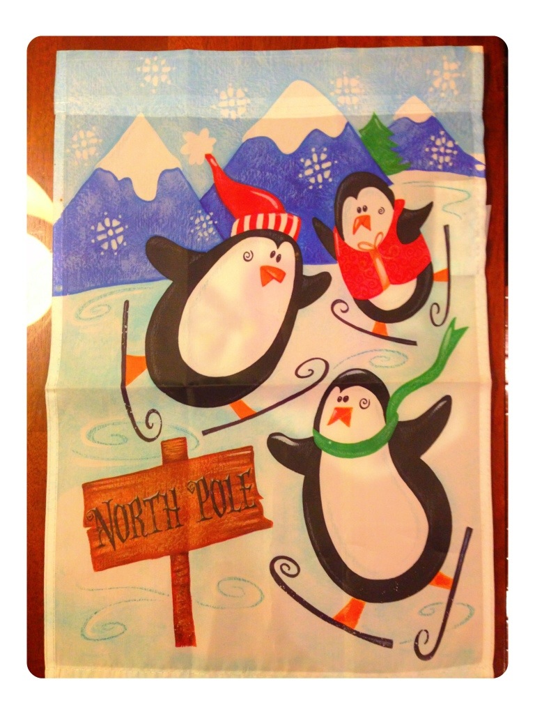 A couple of days ago I noticed a posting from one of my neighbors on our neighborhood Facebook page. Her garden flag had blown away in one of the wind storms. She gave a brief description of it and asked the neighbors to keep an eye out for it. I didn’t immediately note the significance of what was on the flag until Thursday afternoon when I was out in the backyard cleaning up recycling bin escapees. On my second trip down the hill I saw the face of a little penguin on a piece of cloth that was caught up in some bramble. I knew right away that it was E’s flag! As I dusted it off I noticed the THREE penguins on the flag and smiled with tears in my eyes. It had been a particularly rough morning of feeling sad and discouraged yet here I was with a blatant reminder that God is right here with me even on the cold and messy days. OF COURSE, I was the one to find this flag!