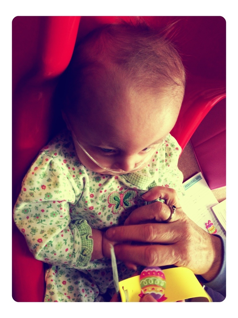 Nora made a bunny hat in therapy this morning. Stickers on her little fingers are really quite fascinating! She was sooo cute!!!