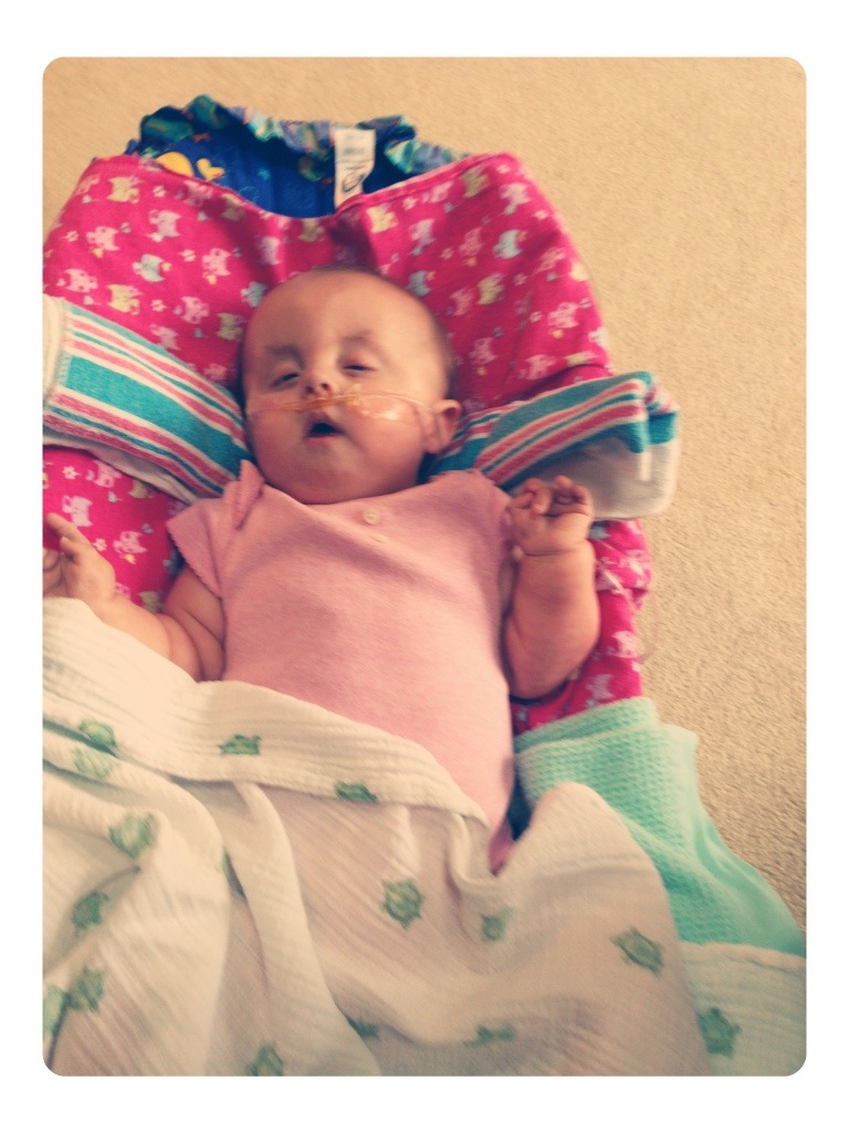 Sometimes Nora stays asleep while I’m getting the big kids off to school–this day, of course, she did not. As she was expressing her utmost displeasure about the situation at hand I noticed the gauge on her oxygen concentrator was malfunctioning. I hooked her up to a portable tank, checked her sats (which were fine), scrambled some eggs, fixed a bottle, brushed and fixed kids’ hair, fed Nora, kissed the kids and saw them out the door, sucked some boogies, made a phone call to get the oxygen concentrator looked at / fixed, peeked out the window at the kids up at the bus stop and then attempted to get a shower for myself and a bath for Nora who was completely encrusted in boogies. Ordinarily I would forgo the shower as I was fortunate to have gotten one the day before. However my hair looked like I had run Crisco through it. It was actually the infant massage oil that became acquainted with my hair from my hands while repositioning my bangs out of my face throughout the day. So same difference. After a two-minute shower it was Nora’s turn. I took my time with her and gently washed her sweet hair and face. I even let her float around in the jets for a couple of minutes before we had to get out. I gently placed her up on the clean towel I had neatly laid out for her which was her cue to puke all over the place. I put the stopper back down in the tub with my foot and quickly re-immersed her and rinsed her off. I laid out another towel from the nearby pile and attempted to get her out again. Puke All Over the Place Part 2. “I…. Feel like… I’ve been here…. And done this before…” It was then that I started laughing because it was so obvious that satan did NOT want me going to Bible study at 9:30!