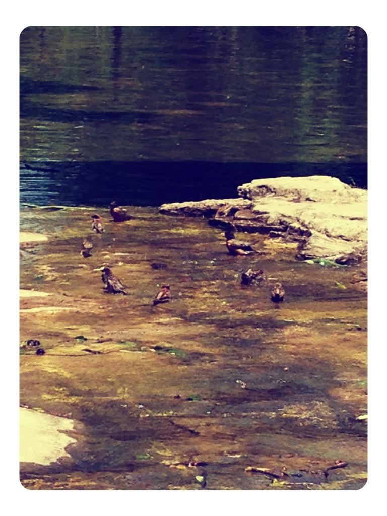 The big kids were still in Cleveland (or on their way home), and Nora was with her nurse. This afforded me a treasured afternoon with my husband. We ate lunch in Eden Park and watched birds frantically bathing on the rocks between two lakes. The still shots don’t accurately portray the frenzied activity that was taking place, but still cute.