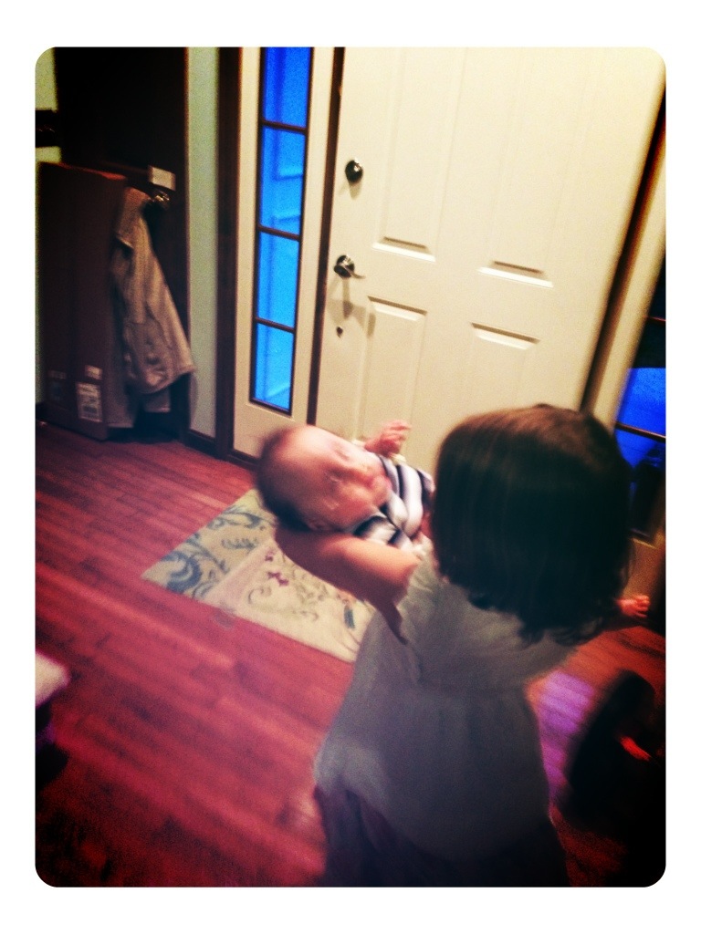Unfortunately this came out blurry – but what a cute moment, Nora being carried up to the baff by her big sister!