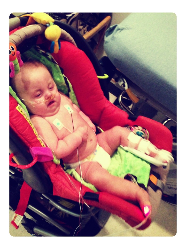 I do wish it were under different circumstances and that I could have visited longer, but I did have to get back home to Nora and her nurse. Back home, things were pretty much the same. Nora was uncomfortable, unhappy and hot. The 102.2° fever warranted another dosing of pain reliever (it was Motrin’s shift), and a lukewarm bath. Slowly but surely her temperature went down and her comfort level improved. Just as we started to breathe a little easier Nora choked up a blob of mucus with a tinge of brown to it. Motrin? Very light orange. Sildenefil? White. Lasix? Clear orange. Could this be blood?? A few phone calls were made and within 15 minutes we were well on our way to the pediatrician’s office with a placated baby girl and a suspicious burp rag in a Ziploc bag.