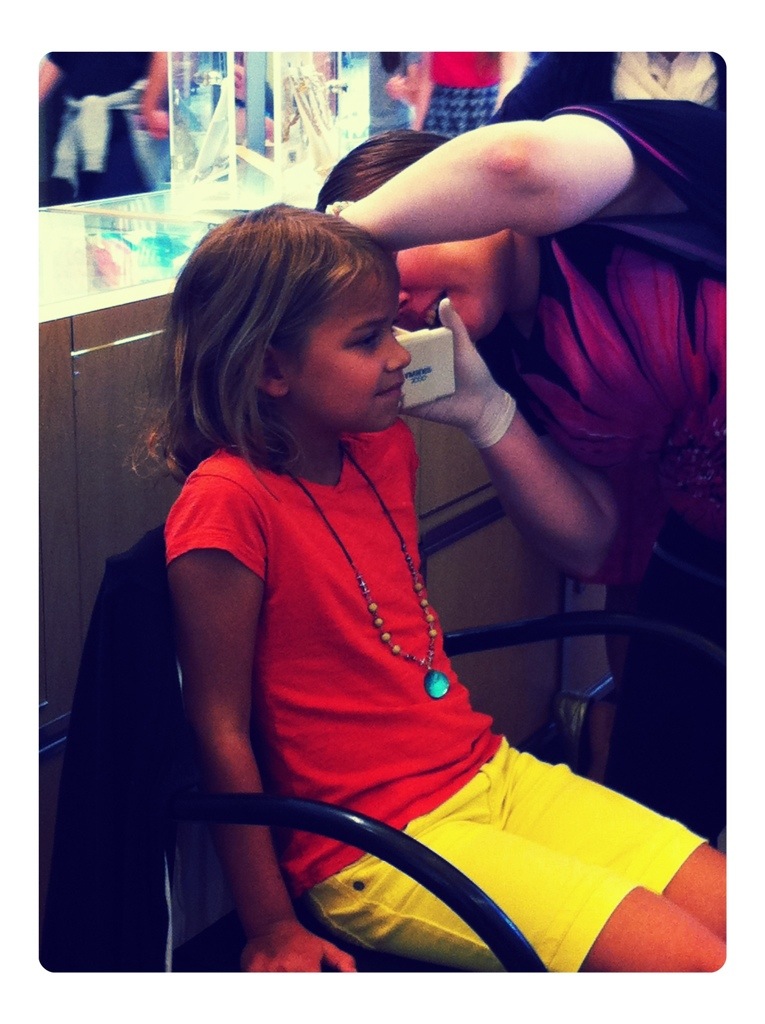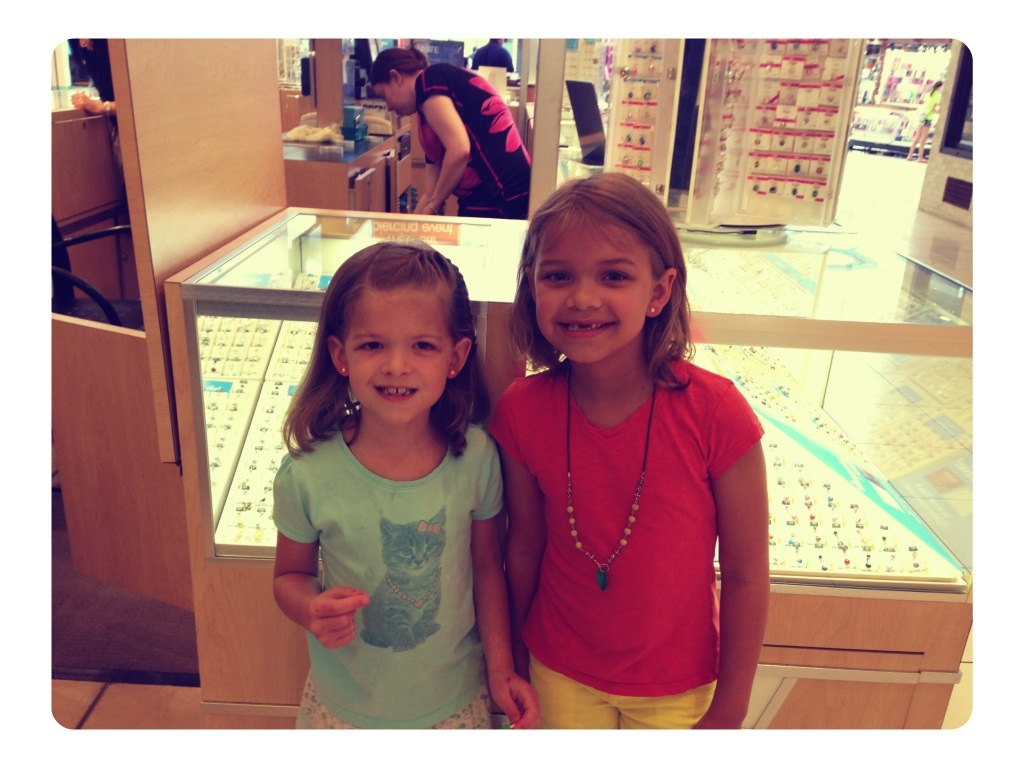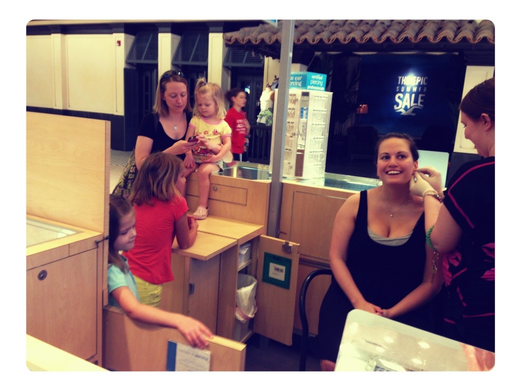 Sunday we met up with Greta’s cousins Gracie, Keira and Aunt Sarah at a mall. Sarah and I decided right there and then that the girls were old enough now to get their ears pierced!!!! 😉 Kelly came with us and went first to exemplify expert bravery.