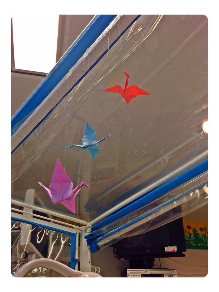 Three good luck origami cranes strung up using a spool of thread from my Grandma’s old sewing kit.