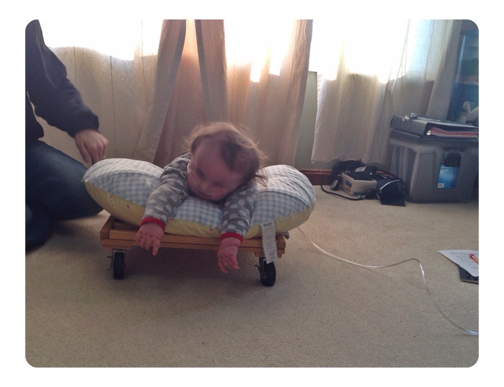 Here is Nora engaging in some belly time during her physical therapy session. She will tolerate being on her belly a little longer if we can distract her with being in motion — on wheels! She would really like for Living Room Bobsledding to be added as a sport in the Special Olympics.