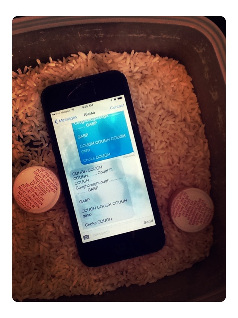 Last Thursday morning I placed my phone on top of a pile of laundry in the laundry basket that I was bringing downstairs. I said out loud to myself, “Do. Not. Wash. The. Phone.” Somehow in the middle of making scrambled eggs, sausage, cinnamon toast, packing lunches, unloading the dishwasher, administering antibiotics and vitamins, signing papers, washing bottles, breaking up fights, loading the dishwasher, fixing hair, untying knotted shoelaces and Windexing the kitchen table my phone ended up in the washer as I absent-mindedly tossed in a load of laundry. I had just got the big kids out the door and up to the bus stop and sat down to eat my own breakfast in peace and quiet while Nora was still asleep. I rustled around for my phone to check the weather when suddenly the horrible realization that my phone was in the middle of the spin cycle dawned on me, “Noooooo!!!” (A sprint to the laundry room shown in dramatic slow motion). Yes indeed… There was my unconscious, barely breathing, April Fresh phone. As it turns out, I ran and did the very thing I later learned you SHOULD NOT EVER do after your phone has been immersed in water. I plugged it in to see if that would help, which put it at risk for short circuiting. Oops. Meanwhile I’m FREAKING out that I had just lost all my pictures, calendars, contacts, text messages, ETC. Thank goodness for iCloud – I did not lose anything!!! If you ever find yourself as the unfortunate owner of a waterlogged phone, here is the advice I gleaned in my quest for its revival: leave the phone turned off and do not plug it in. Put it in a sealed container of uncooked rice and some silica gel beads (those delicious-looking and enticing DO NOT EAT packets that come with new shoes, etc.) Or you can use the silica gel capsules that came with your daughter’s hearing aide kit………… Allow the phone to convalesce for a couple of days. After a day or two, hold your breath, say a prayer, plug it in and turn it on.