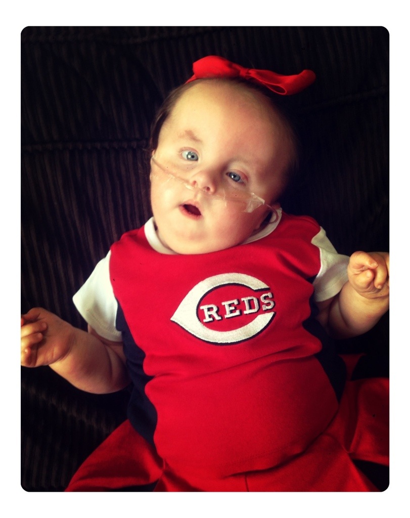 Nora cheered on the Reds from home while Daddy and Brudder were at the game representin’.
