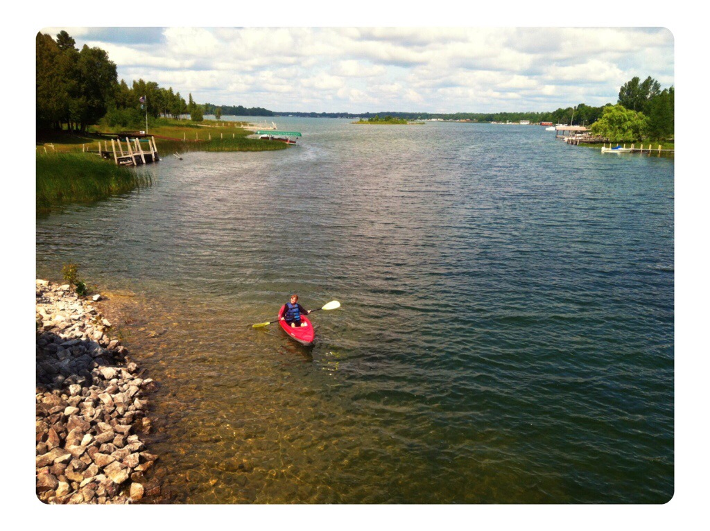 The previous day we were taken aback to learn that the house our families rented for 4 consecutive summers on the neighboring island was gone. In its place stood a newly constructed, very large and unfamiliar house. It is a beautiful home but is rudely oblivious to its imposure on our sacred ground. This place was the backdrop of so so many treasured memories that now exists only in pictures and in thought. We stopped by in the car Sunday to have a look around. We gathered a few rocks and left a few tears. William and I oared past again in the kayaks today. You can see the newly built house in the background of the picture below.