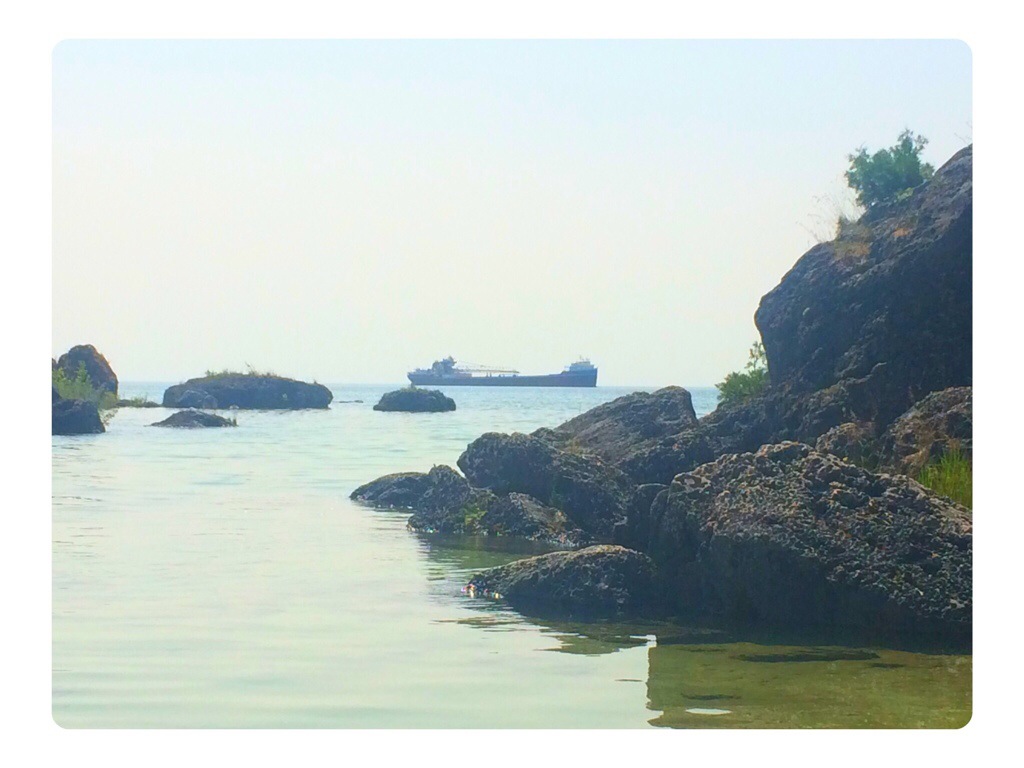 We are towing the 2 red kayaks behind us and are moving along at a slower pace. As we pass the dolomite mines we are disappointed that there isn’t a huge freighter to admire.
