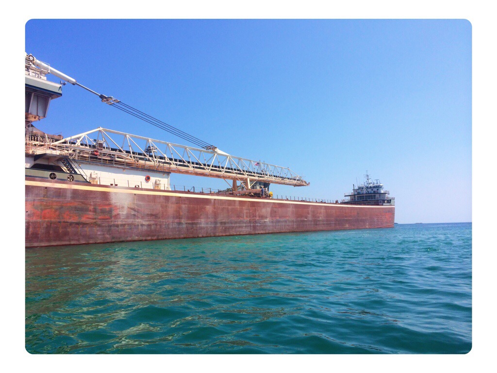 The freighter is the Wilfred Sykes. We watch in awe as this monstrosity of steel turns around and then backs into port over the course of about twenty minutes. Several of the crew repel down to shore once the steel cables are roped into place. Fascinating.