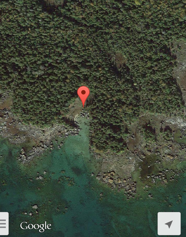 We drop the kayaks off at our intended destination and then continue on to investigate the freighter. I am amused, but not surprised to note that the aerial view of Narnia’s gorgeous cove is somewhat heart shaped!
