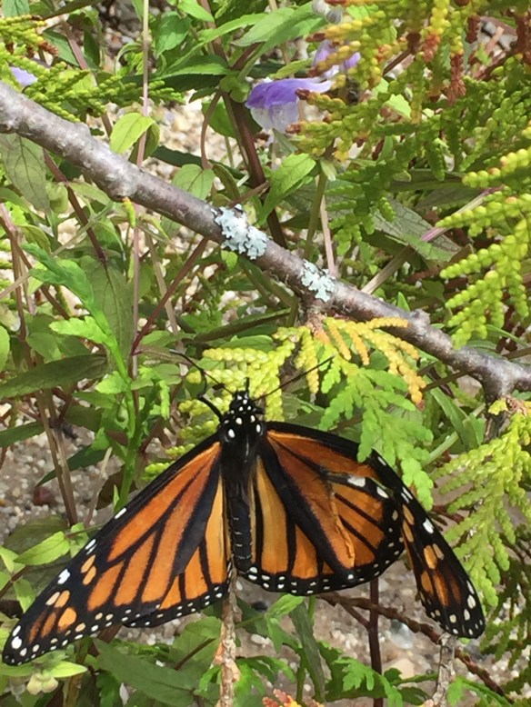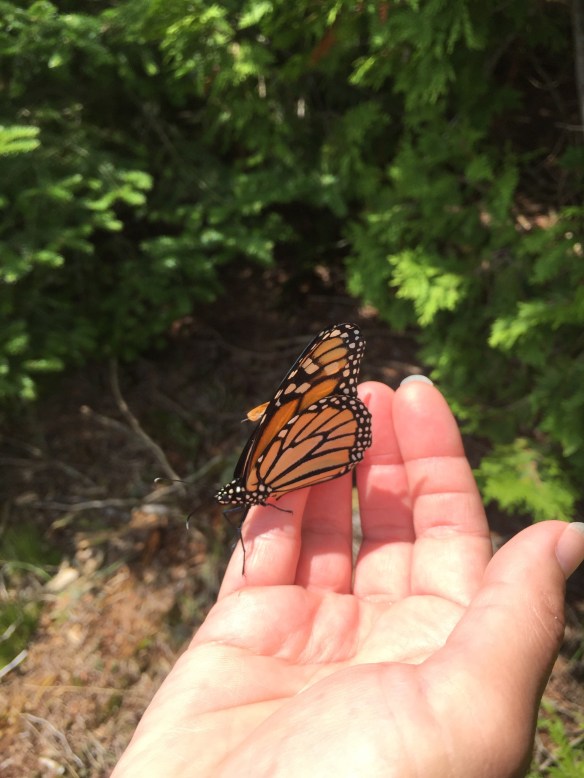 I stood there attempting to capture it in photos, hopeful that maybe just one shot would do it justice. As I glanced down at my feet in the sand, a fleck of orange caught my eye. Clinging to a pine sapling, dangerously close to the lapping waves was a beautiful monarch butterfly. I moved slowly closer and discovered that his upper right wing was badly torn and tangled under his lower wing, rendering him flightless. To have once soared the crisp blue skies, there he sat awaiting certain death.
