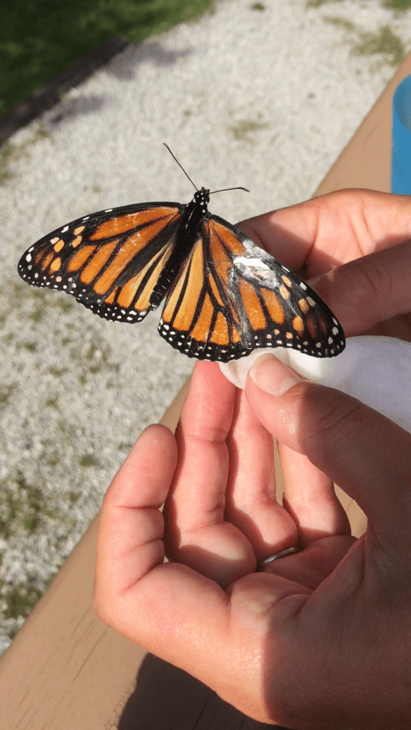 Greta held the procedural restraints in place (tweezers) while Gavin was in charge of the surgical lamp (my phone flashlight). Ever so extremely carefully I positioned the veins of the wing parts together and adhered them with dabs of super glue on toothpicks. I held them in place at length, careful not to involve any other of the wings with the glue. The 5 second dry time as promised on the glue packaging was much to be desired. 🙄 After the glue had finally set at the crucial points, I set about repairing the small hole that remained in the middle of the wing. Livemonarch.com suggested using a small bit of sturdy paper. I cut out a small spot of very lightweight cardboard and glued it beneath the wing, successfully patching the hole. After it had all dried, I did as instructed and coated the fracture lines with a light dusting of baby powder using a Q-tip. At long last we were ready to bring the patient back outside.<